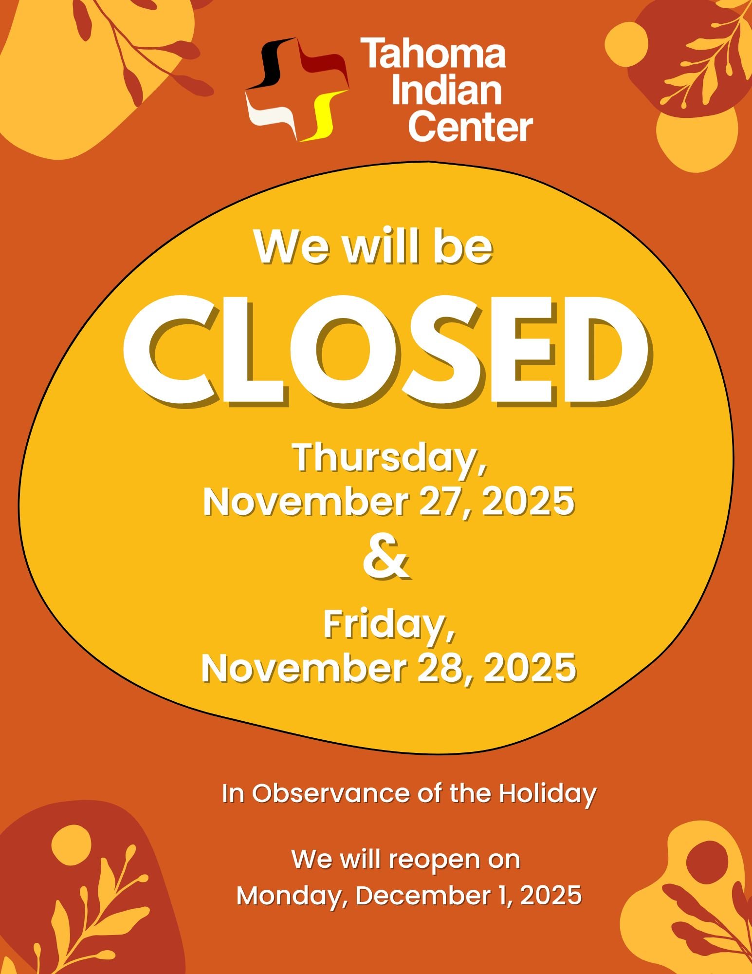The Tahoma Indian Center will be closed from Thursday, November 27th through Friday November 28th in honor of Potlatch Days.